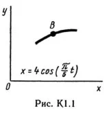 Под номером К1 помещены две задачи К1а и К1б, которые надо решить. Задача К1а. Точка В движется в плоскости xy (рис. К1.0 — К 1.9, табл. К1; траектория точки на рисунках показана условно). Закон движения точки задан уравнениями: x = f1(t), y = f2(t), где x и y выражены в сантиметрах, t — в секундах. Найти уравнение траектории точки; для момента времени t1 = 1 с определить скорость и ускорение точки, а также ее касательное и нормальное ускорения и радиус кривизны в соответствующей точке траектории. Зависимость x = f1(t) указана непосредственно на рисунках, а зависимость y = f2(t) дана в табл. K1 (для рис. 0—2 в столбце 2, для рис. 3—6 в столбце 3, для рис. 7—9 в столбце 4). Как и в задачах С1 — С4, номер рисунка выбирается по предпоследней цифре шифра, а номер условия в табл. К1 — по последней. Задача К1б. Точка движется по дуге окружности радиуса R = 2 м по закону s = f(t), заданному в табл. К1 в столбце 5 (s — в метрах, t — в секундах), где s =AM — расстояние точки от некоторого начала A, измеренное вдоль дуги окружности. Определить скорость и ускорение точки в момент времени t1 = 1 с. Изобразить на рисунке векторы v и a, считая, что точка в этот момент находится в положении M, а положительное направление отсчета s — от А к М.