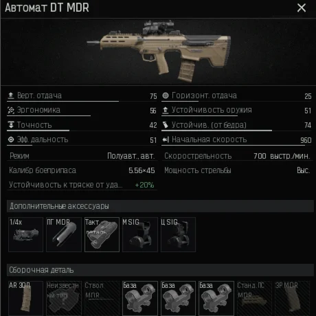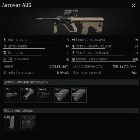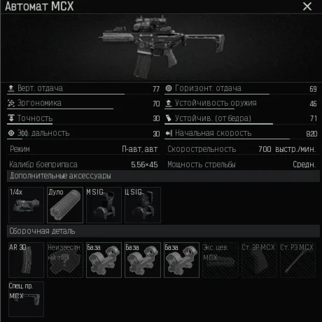AUG с вертикальной отдачей - 77, с прицелом 1x/4x, патроны - M955; M4A1 с вертикальной отдачей - 71, с прицелом 1x/4x, патроны - M855; MCX с вертикальной отдачей - 77, с прицелом 1x/4x, патроны - M855; MDR с вертикальной отдачей - 75, с прицелом 1x/4x, патроны - HP и тогда переменные с такими значениями: