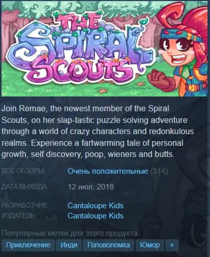 Join Remae, the newest member of the Spiral Scouts, on her slap-tastic puzzle solving adventure through a world of crazy characters and redonkulous realms. Experience a fartwarming tale of personal growth, self discovery, poop, wieners and butts.
