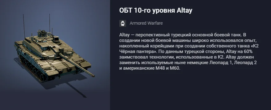 Altay — перспективный турецкий основной боевой танк. В создании новой боевой машины широко использовался опыт, накопленный корейцами при создании собственного танка «K2 Чёрная пантера». По данным турецкой стороны, Altay на 60% заимствовал технологии, использованные в K2. Altay должен заменить используемые ныне немецкие Леопард 1, Леопард 2 и американские M48 и M60.