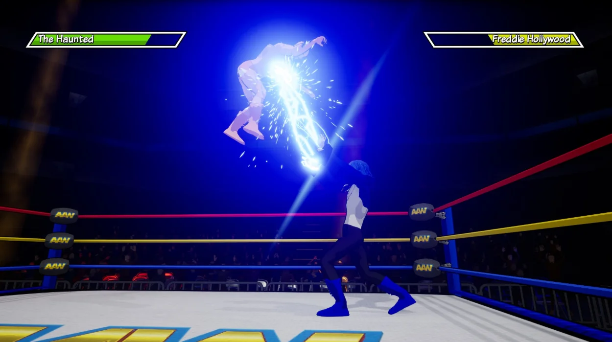Выполняйте BODY SLAM, сбивайте их с ног CLOTHESLEWAY, проведите классический PILEDRIVER И... стреляйте МОЛНИЯМИ в лицо противника?! Что бы вы ни делали... не смотрите вверх на свет!