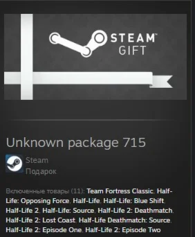 Включенные товары (11): Team Fortress Classic, Half-Life: Opposing Force, Half-Life, Half-Life: Blue Shift, Half-Life 2, Half-Life: Source, Half-Life 2: Deathmatch, Half-Life 2: Lost Coast, Half-Life Deathmatch: Source, Half-Life 2: Episode One, Half-Life 2: Episode Two