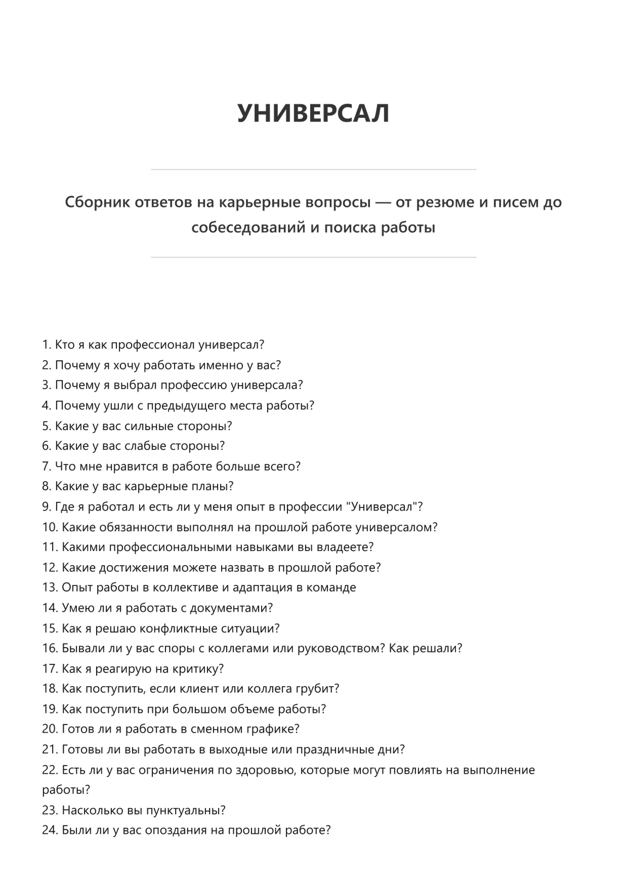 Эта электронная книга представляет собой сборник вопросов и ответов, которые часто возникают у соискателей на разных этапах поиска работы. В ней собран практический опыт и советы, которые помогут быстрее разобраться в нюансах трудоустройства и уверенно действовать в любых ситуациях.