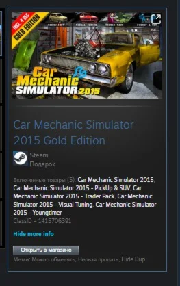 Включенные товары (5): Car Mechanic Simulator 2015, Car Mechanic Simulator 2015 - PickUp & SUV, Car Mechanic Simulator 2015 - Trader Pack, Car Mechanic Simulator 2015 - Visual Tuning, Car Mechanic Simulator 2015 - Youngtimer
