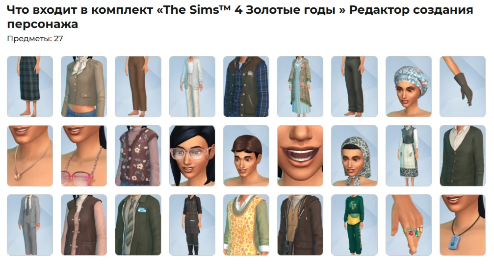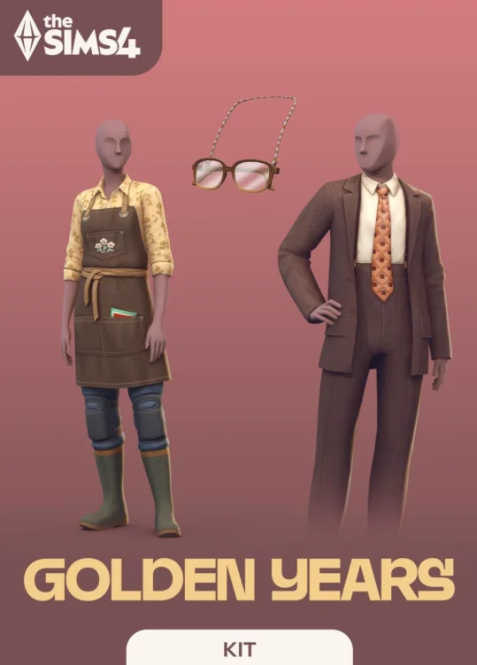 Одежда из комплекта разработана специально для пожилых симов, а среди аксессуаров вы найдете очки на шнурке, парик, садовые перчатки и другие практичные вещи.