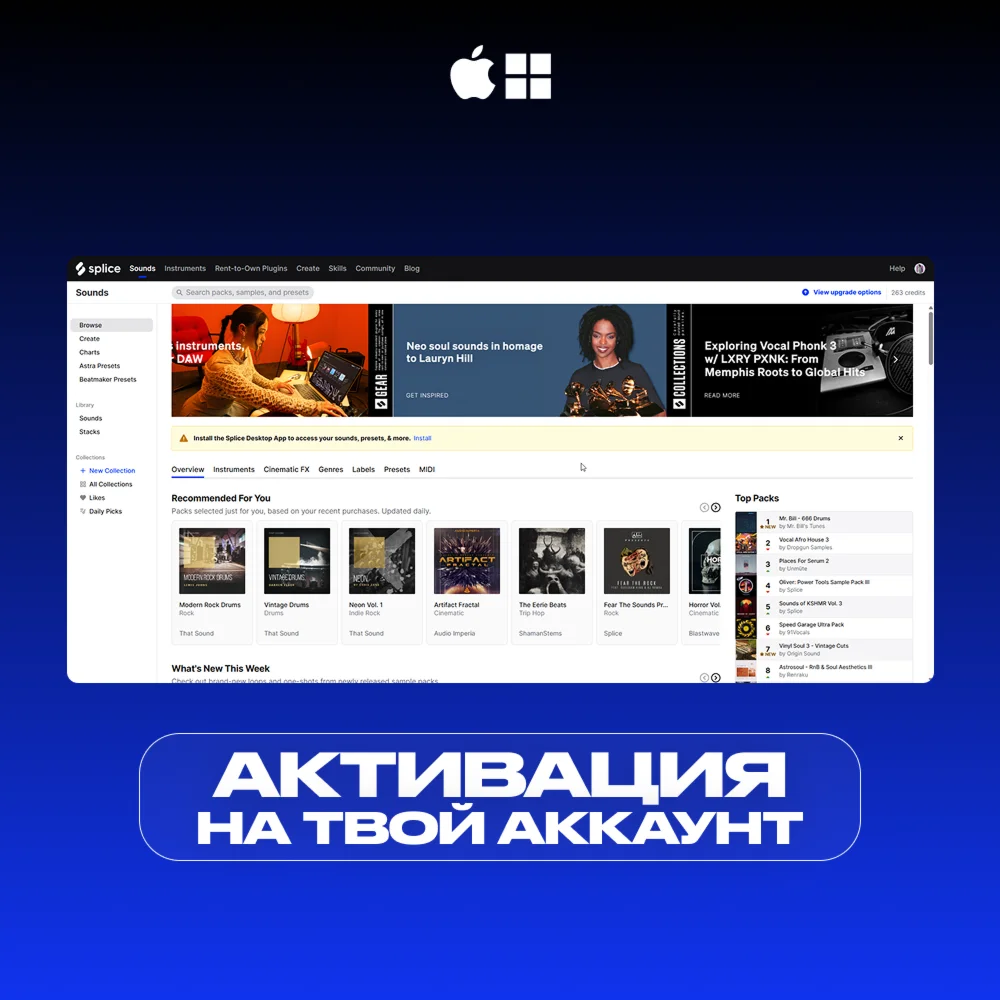 Splice — подписка для тех, кто создает звук. Официальный доступ к библиотеке сэмплов, лупов, one-shot'ов, FX и VST-инструментов, используемых продюсерами по всему миру. Ты получаешь не просто звуки — а готовую экосистему для вдохновения, идей и релизов.
