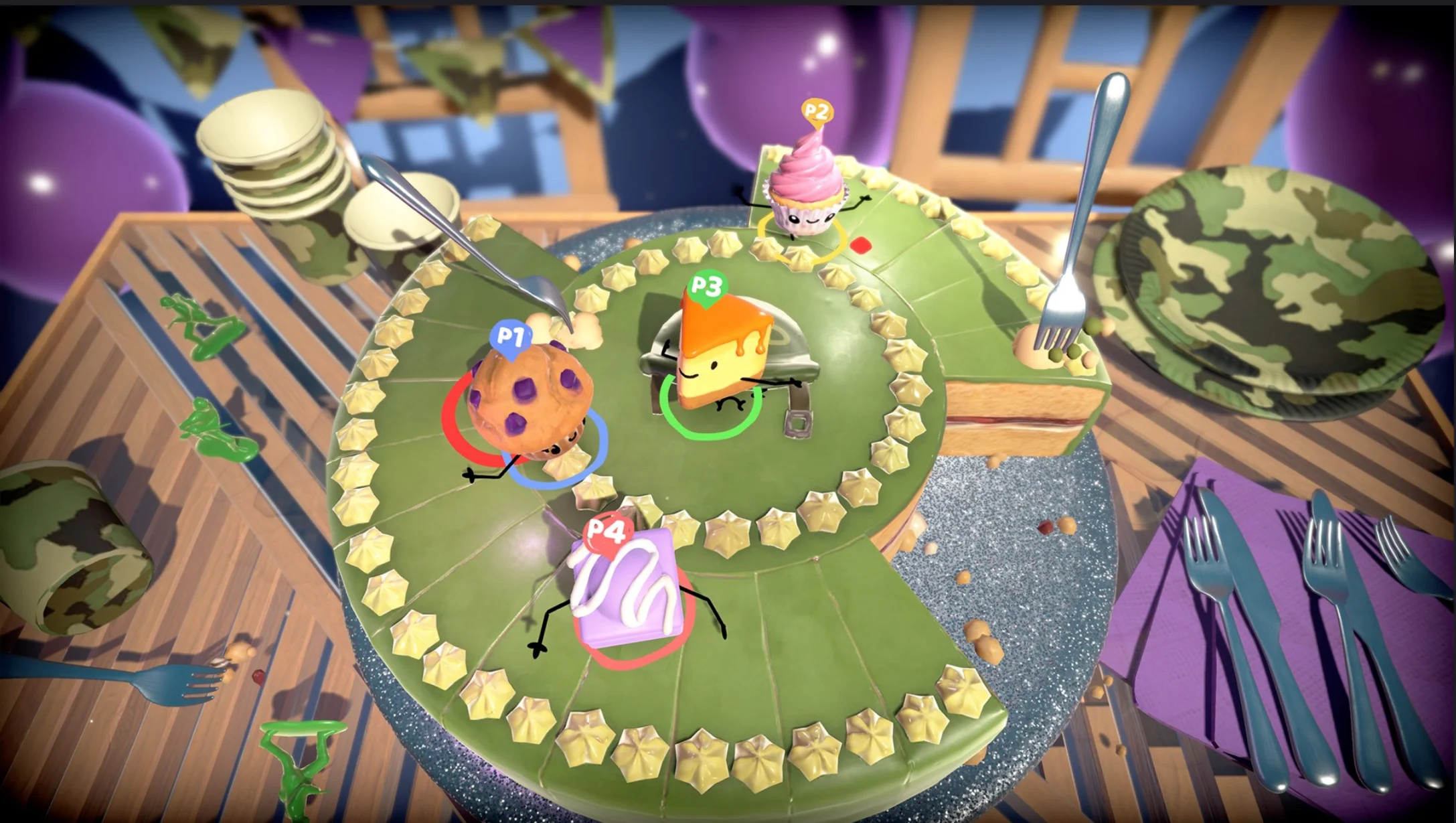 Сражайтесь за звание самого вкусного торта в Cake Bash! Безумная игра для 4 игроков, где очаровательные торты оживают, чтобы сражаться друг с другом. Выберите свой любимый торт и сражайтесь на различных аренах с уникальными заданиями. Обсыпьте себя конфетами или бросьте фрукты в торт — здесь есть что-то для каждого! Чтобы расслабиться, есть несколько мини-игр в вашем распоряжении. Испеките идеальный зефир, добейтесь лучшей глазури или станьте последним выжившим флан в Gateau Royale. Проведите свои торты по пекарне, готовя их, чтобы произвести впечатление на клиента в Tasty! Покупайте начинки в серии игр, чтобы стать выбранным тортом... Или вы можете просто играть в свой любимый режим снова и снова. Решать вам! Пройдите один и тот же уровень, найдите онлайн-испытания или сразитесь с хорошо пропеченными ботами. Пора выпрыгнуть из печи и на сковороду!