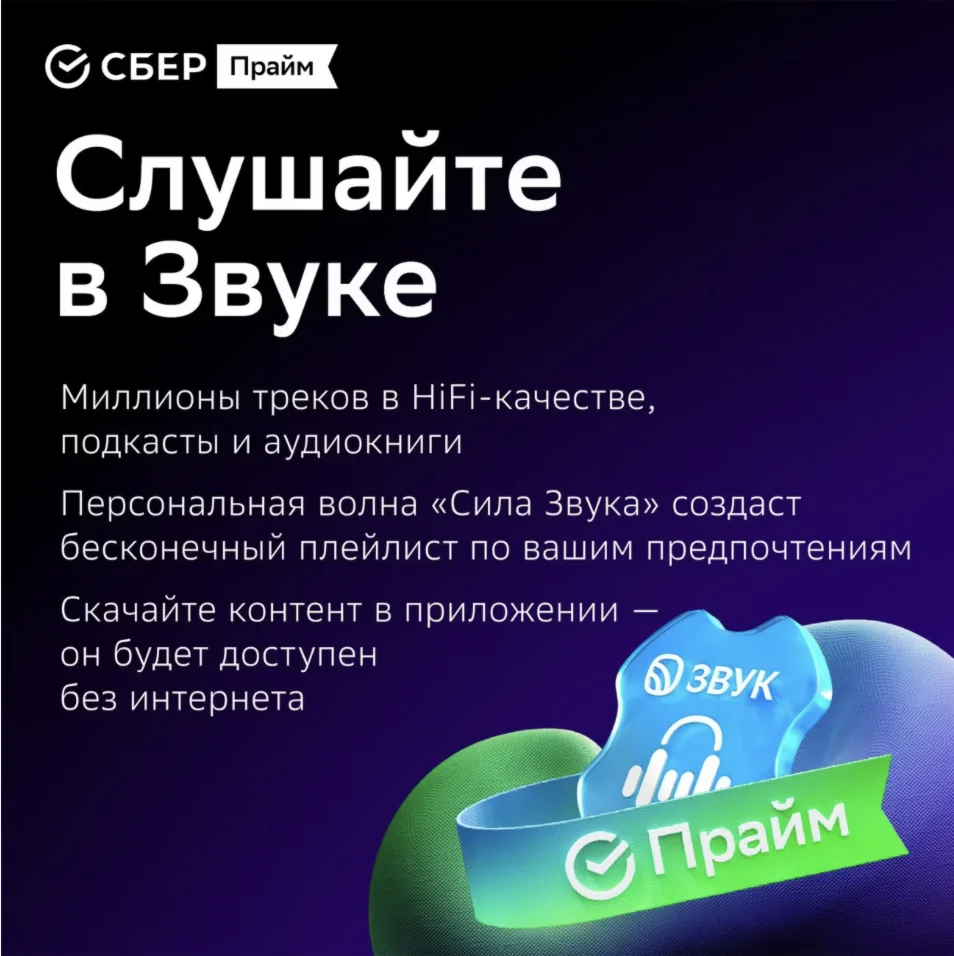 • Все преимущества «СберПрайм» Музыка, подкасты и аудиокниги в сервисе «Звук», бонусы «Спасибо» в «Самокате», «Купере», «Ситидрайве», бесплатное обслуживание карты, надбавки по «СберВкладу» и др.