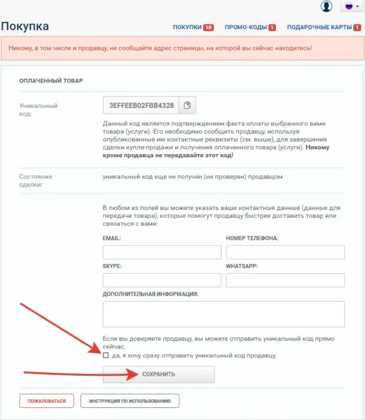 1) На странице покупки скопируйте полученный уникальный код в буфер обмена.
